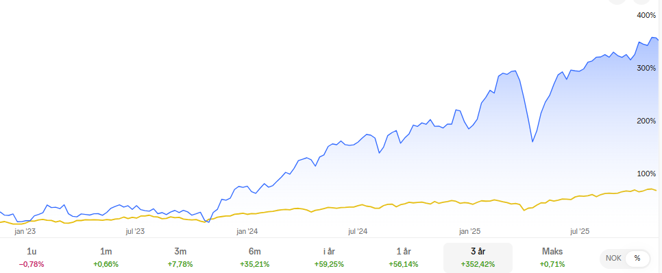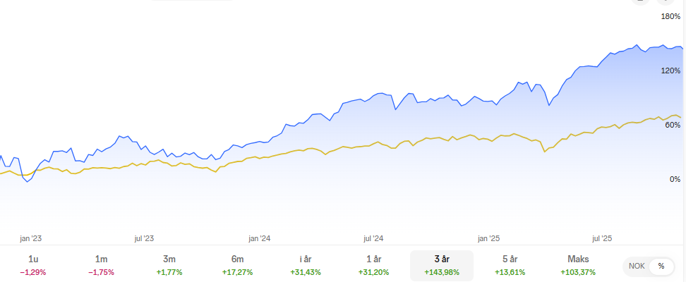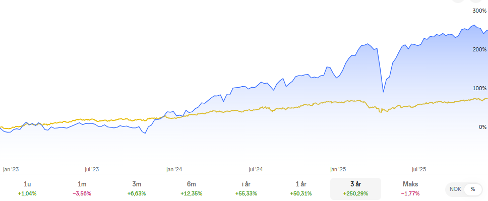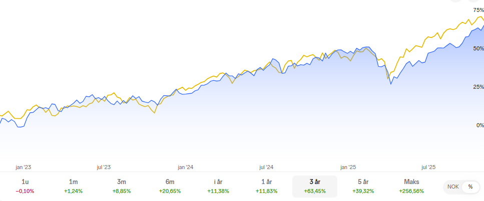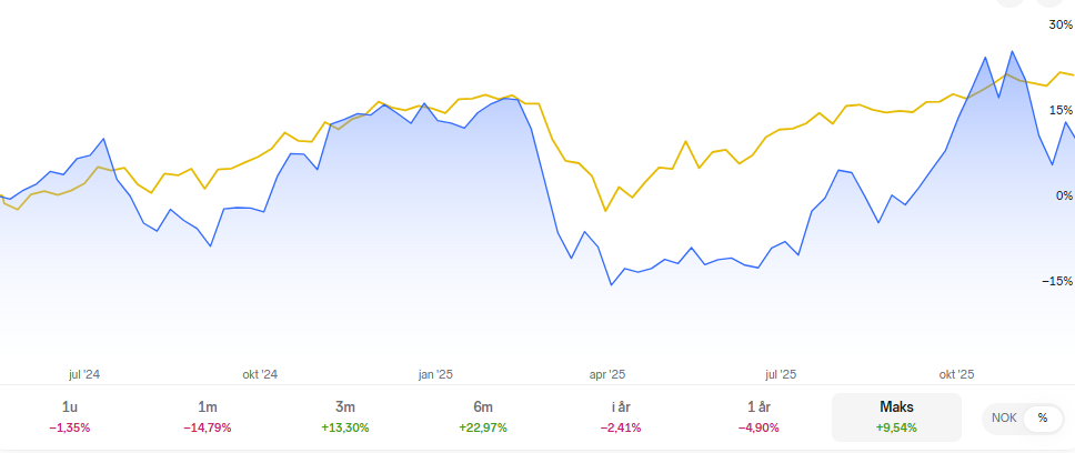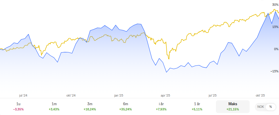 I perioden 29.okt – 4.nov. har det ikke vært transaksjoner i porteføljen. -Mot normalt. Èn grunn til dette er turbulente tider innen tyngre tema i porteføljen som energi, AI, bærekraft og forsvar. I slike tider er prinsippet om å være svært forsiktig med å «unngå å fange en fallende kniv» viktig.