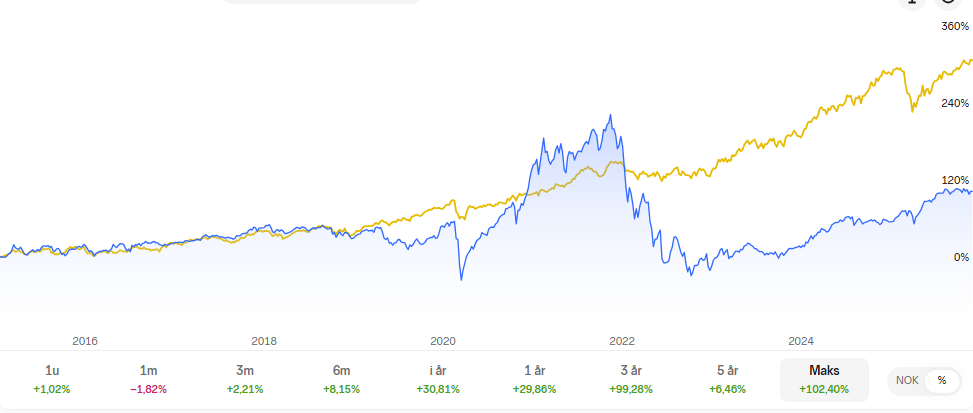 Siden mai 2024 har jeg også investert i en portefølje primært notert på Nasdaq/ S&P 500, men også med innslag fra Toronto/ Canada. Markedet er svært interessant, men utfordrende. Vi har fortrinnsvis valgt aksjer innen høy/ middels risiko. Dette både ut fra potensiale, men også ut fra ønske om kunnskapsbygging ved å jobbe med krevende cases.