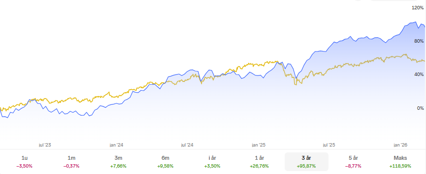 Vi sammenligner oss med DNB Global Indeks (gul linje)