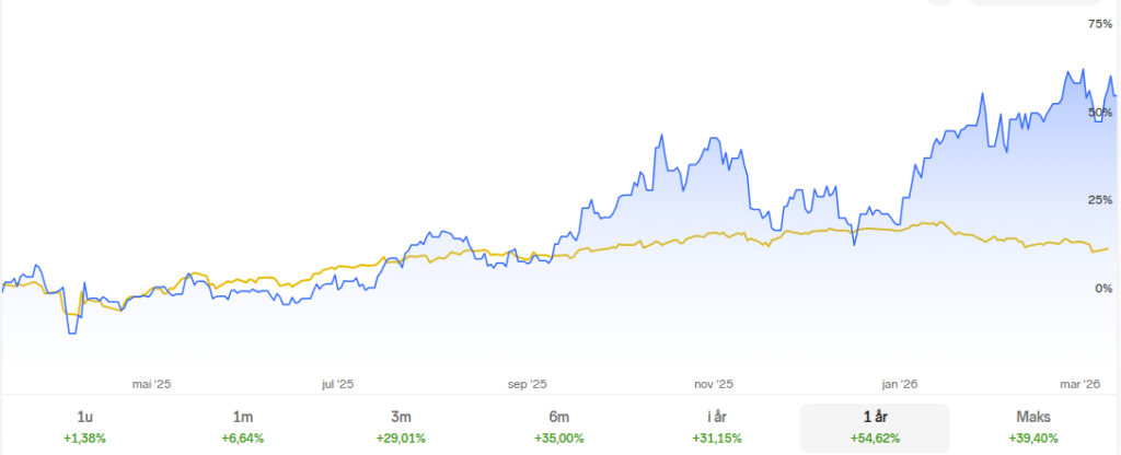 Vi sammenligner oss med DNB Global Indeks (gul linje)
