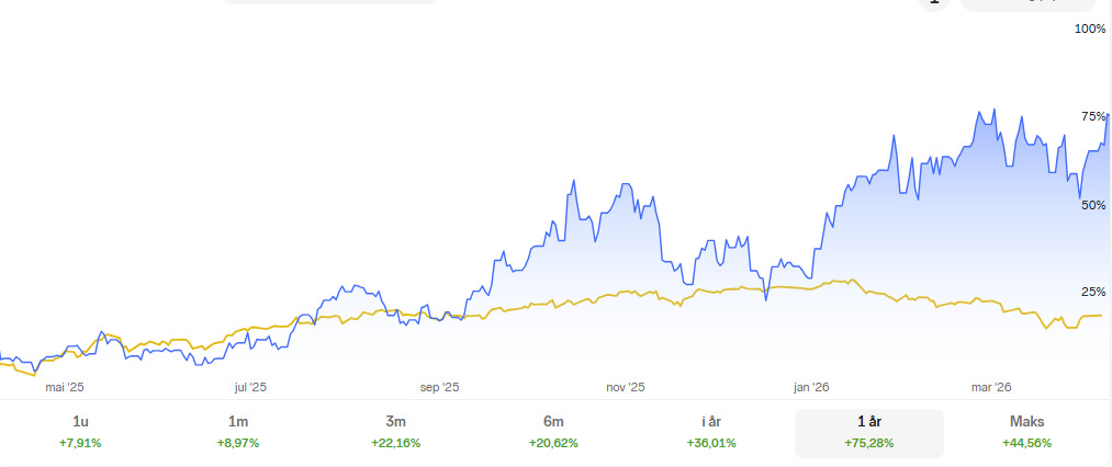 Porteføljen er opp 10,2% siste måned, opp hele +75% siste 12 mnd. Global indeks hhv. -3,4% og +10%.